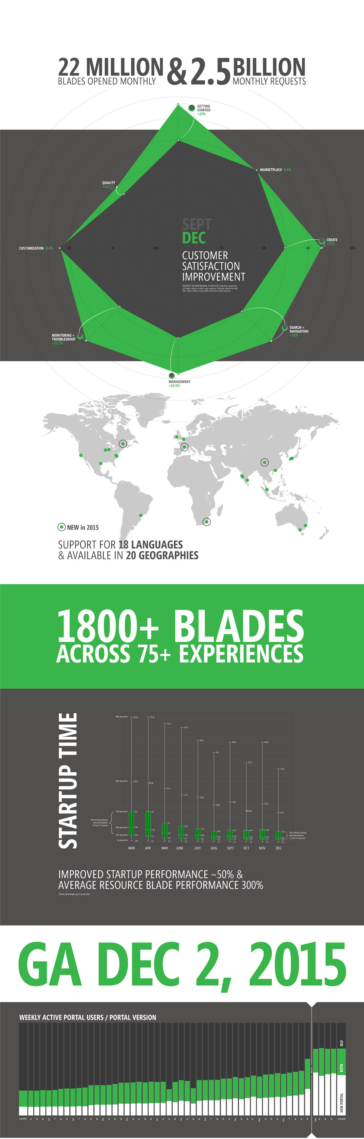 From 2012–2014 I worked on the design and implementation of data visualizations in the Microsoft Azure Portal. This worked developed out of 'live-tile' content I was already doing: pages (blades) could be pinned to a start board (dashboard) and customized to eight tile sizes with content and layout adjusted and prioritized for each size. The charting followed suit.