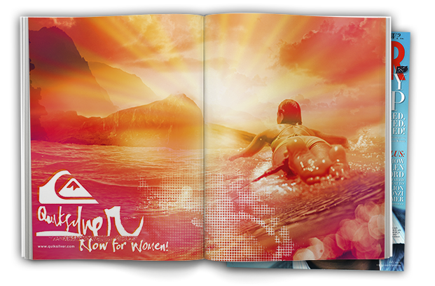 When Quiksilver launched a line for women directly under the Quiksilver brand (instead of under Roxy) they started a "Now for Women" campaign that I was disappointed with. The ads I saw were more what you would expect from GAP or Old Navy. They didn't represent the surf/skate/summer lifestyle of the Quiksilver brand, so I mocked up a couple of things for fun: some magazine ads utilizing image compositions with overly stylized lighting, a double sided bag insert for clothing retailers to push the new release in stores, and a wrist band to give out at summer water sport events (surf, kite-surf, paddleboard, etc).